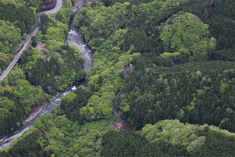 骨の一部が発見されたキャンプ場周辺=山梨県道志村で2022年4月27日午前10時1分、本社ヘリから