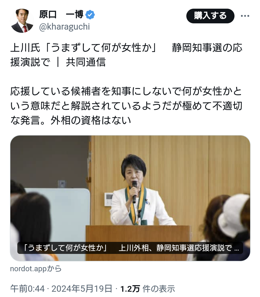 上川陽子外相は18日、静岡県知事選の応援のため静岡市で演説し、自民党推薦候補の当選に向け「私たち女性がうまずして何が女性でしょうか」と述べた。新たな知事を誕生させるという趣旨とみられるが、出産したくても困難な状況にある人への配慮に欠けるとの指摘が出る可能性がある。