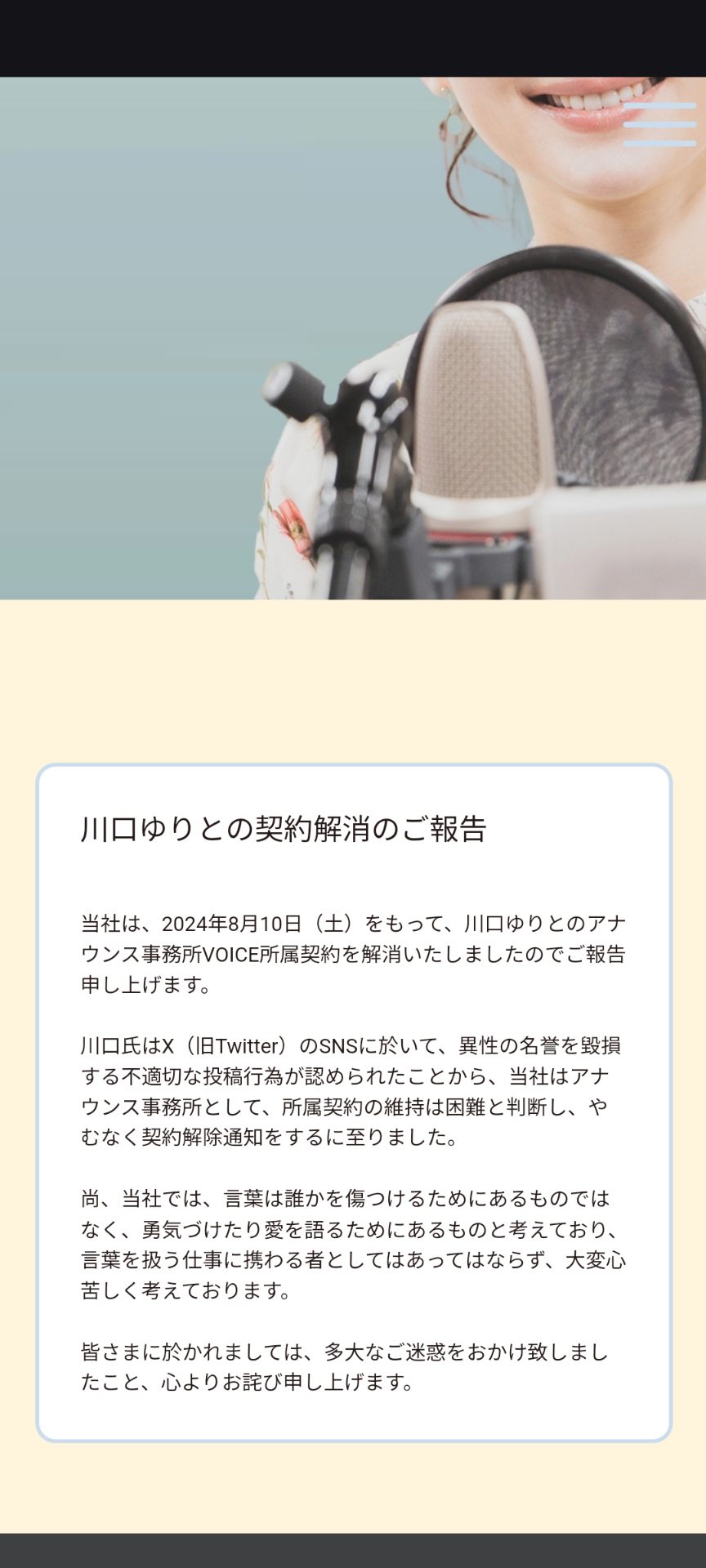 所属事務所「VOICE」も10日をもって契約を解除。「異性の名誉を毀損する不適切な投稿行為が認められたことから、当社はアナウンス事務所として、所属契約の維持は困難と判断し、やむなく契約解除通知をするに至りました。