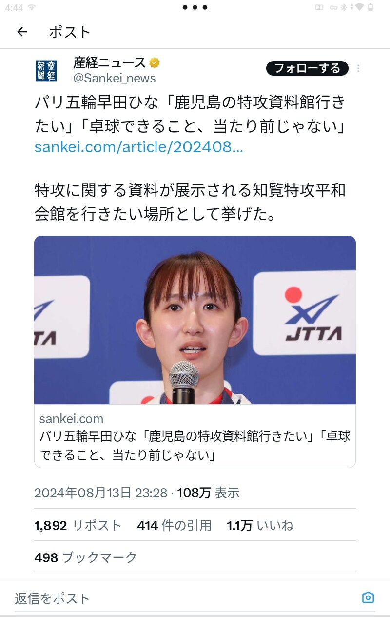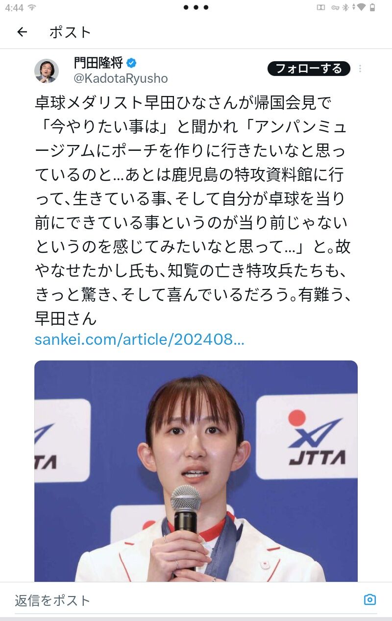 28年ロサンゼルス大会に向けては「この4年間自分と向き合って心、技、体、全てで究極に持っていけるよう挑戦していきたい」と決意。帰国して何がしたいかの問いには「アンパンマンミュージアムに行きたいのと、鹿児島(知覧)の特攻平和会館に行って、自分が生きているのと卓球ができているのが当たり前じゃないことを感じたい」と話した。