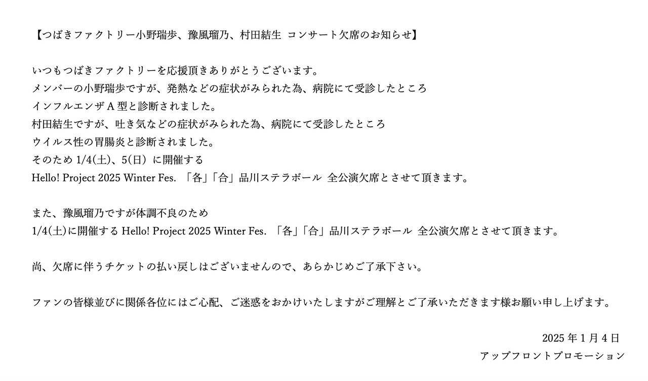 【つばきファクトリー小野瑞歩、豫風瑠乃、村田結生 コンサート欠席のお知らせ】