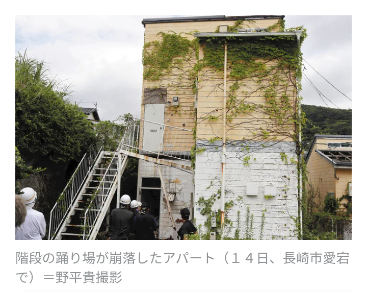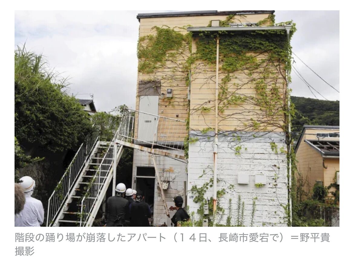 13日午後10時30分頃、長崎市愛宕で、「アパートの階段が崩れて人ががれきに埋まっている」と119番があった。長崎県警長崎署によると、2階建てアパートの2階の踊り場が崩れて同市の男性2人が転落し、病院に搬送されたが、このうち40歳代男性が約1時間後に死亡した。