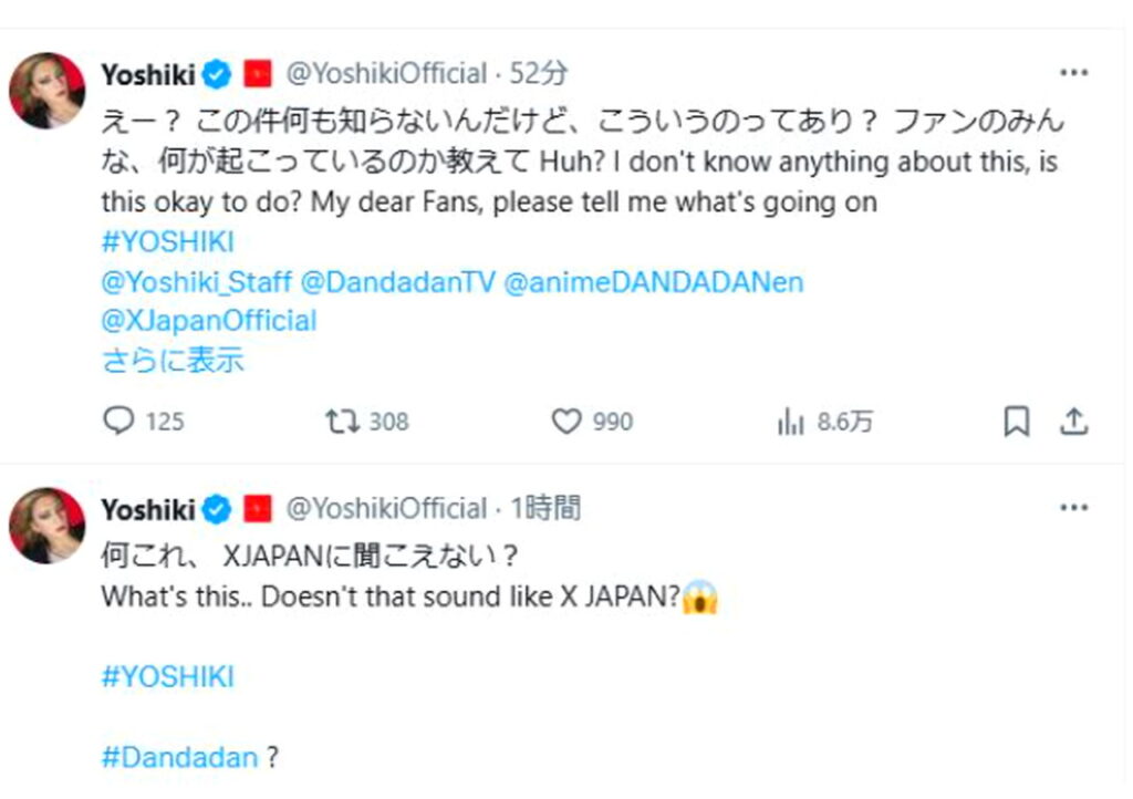 X JAPANのYOSHIKIが9日、X(旧ツイッター)を更新。テレビアニメ「ダンダダン」の劇中歌「Hunting Soul」をめぐって、関係者で話し合いが行われることを明かした。