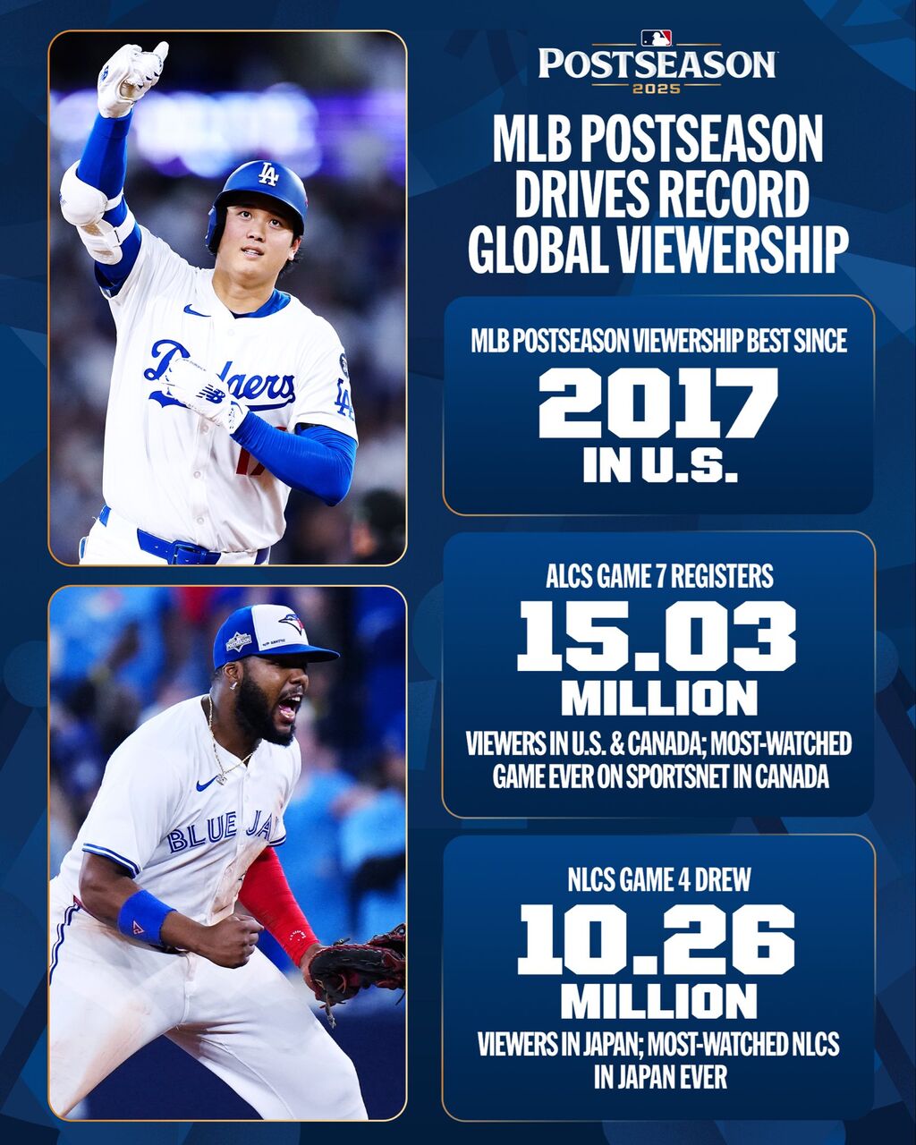 なおMLB唯一のカナダの球団・ブルージェイズがワールドシリーズ(WS)進出を決めたマリナーズとのア・リーグ優勝決定シリーズ(ALCS)第7戦は、米国とカナダの合計で平均1503万人の視聴者数を記録。