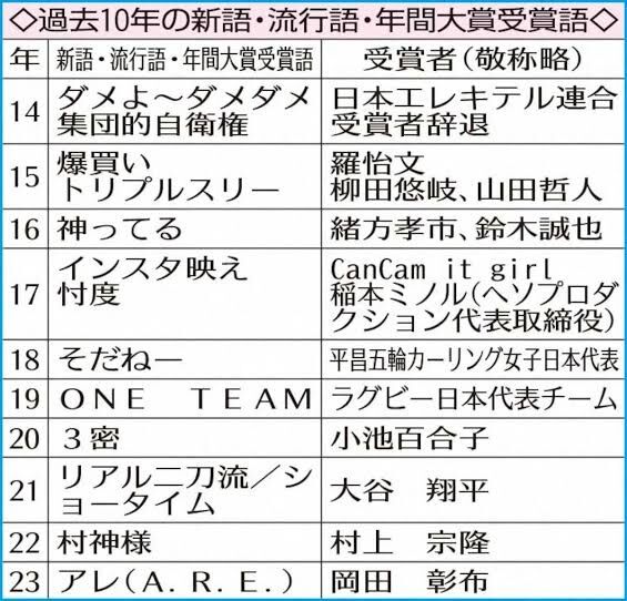 | 新語・流行語大賞(しんご・りゅうこうごたいしょう、正式名称は「『現代用語の基礎知識』選 新語・流行語大賞)は、自由国民社がその年1年間に発生した「ことば」のなかから選考し、その「ことば」に関わった人物、団体を顕彰するとされている賞。2004年(平成16年)からは「『現代用語の基礎知識』選… 132キロバイト (11,968 語) - 2025年11月5日 (水) 09:30 |