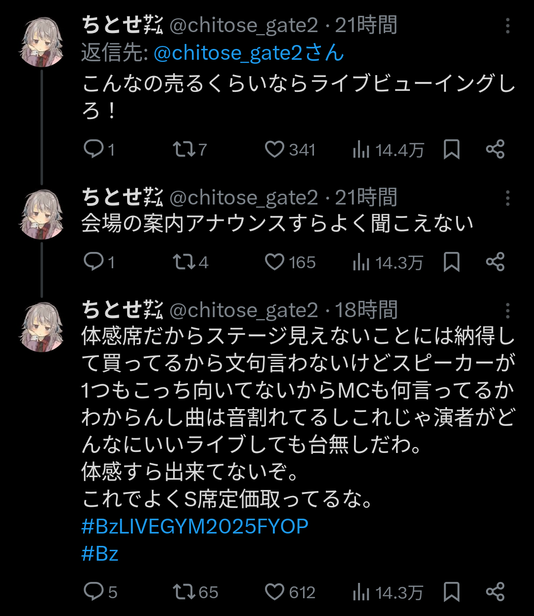 あと毎回ではないけど、たまにこっちの方にだけ歌ったり、演出の一環でB'zの2人と接近できるから、それ目当てで買う人もいる。要は公認のガチャ席。引くなら外れても文句言うなよ、がファンの大多数の意見だと思う。