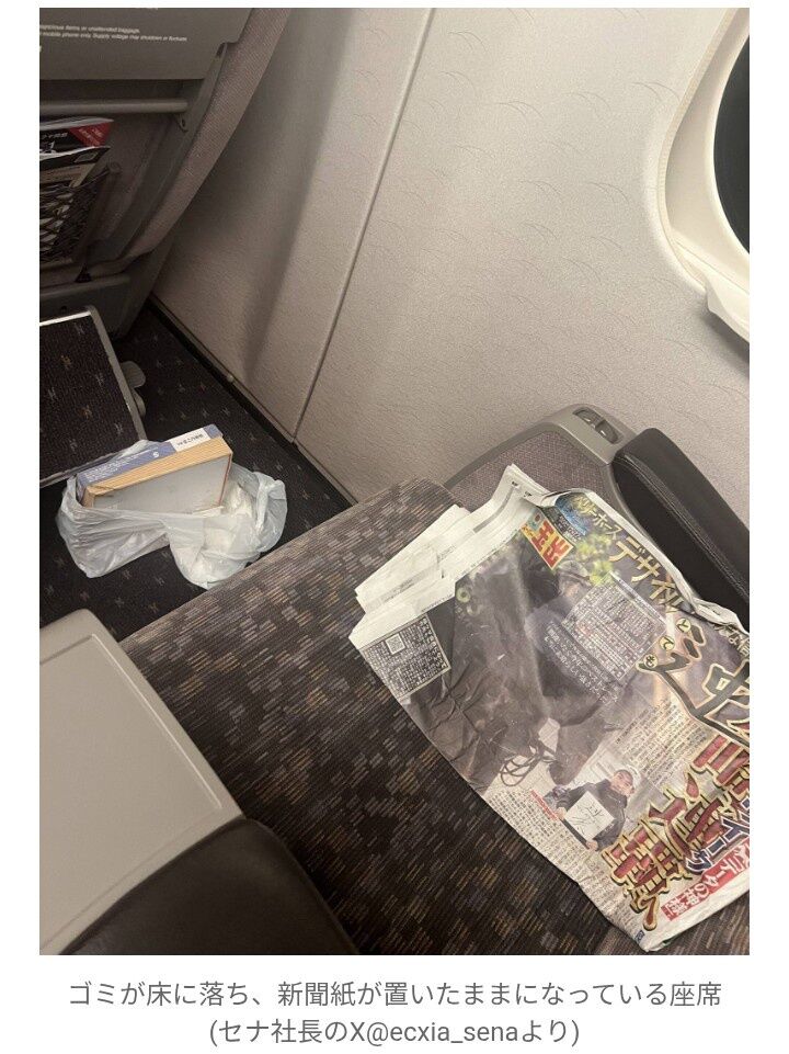 「新幹線この状態でいなくなるジジイやばいだろ!」とコメントを添え、ゴミが床や座席の上に放置された座席の写真をXに公開したのは、メディアで〝セナ社長〟と呼ばれる宮本聖菜社長。