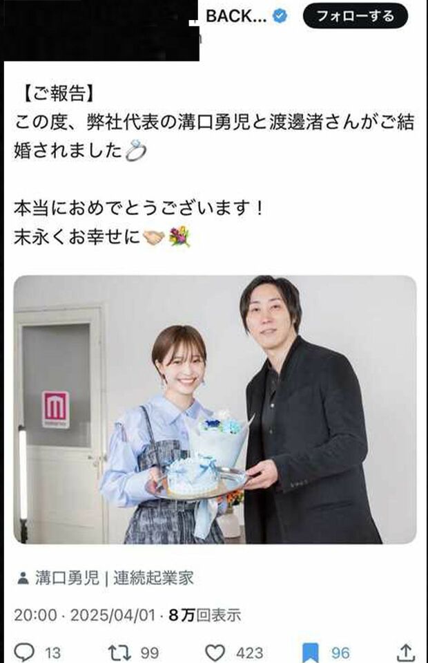 国木田さりまる「溝口勇児と渡邊渚が結婚」と投稿し炎上wwwwww